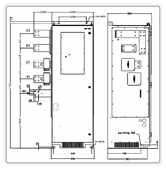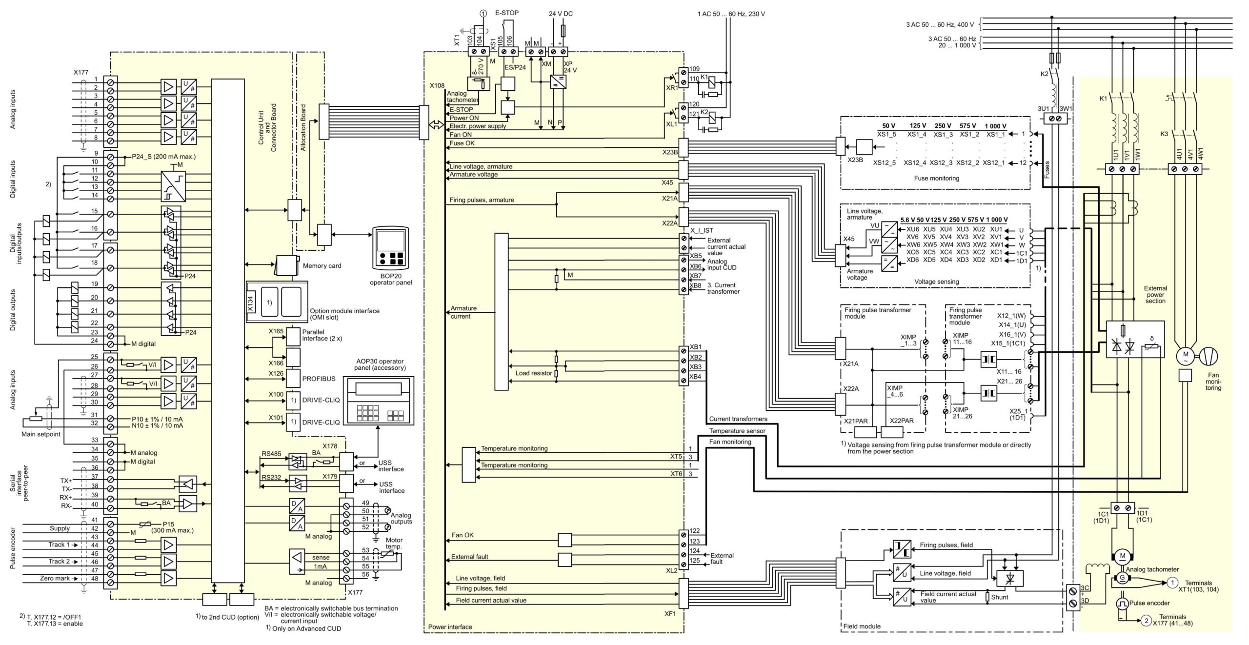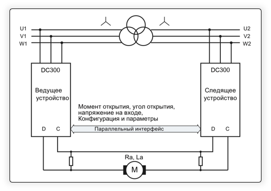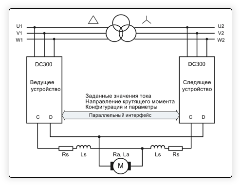Привод DC300 состоит из 2-х частей — блока управления DC200 CM для управления выпрямительным мостом и обмоткой возбуждения силовой части – тиристорным выпрямителем мостовой схемы для якорной цепи двигателя.